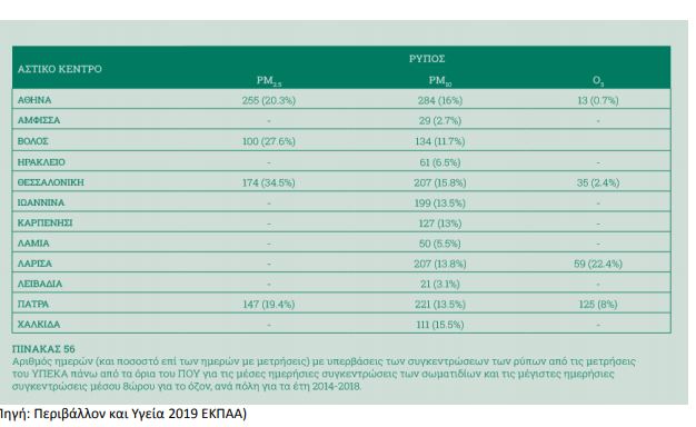 Σε πρόσφατη δημοσίευση του ΕΚΠΑΑ (Περιβάλλον και Υγεία 2019) παρουσιάζονται αναλυτικά στοιχεία που δείχνουν την άμεση ανάγκη για μείωση των ρύπων. Μεταξύ των ετών 2014-2016, ο ετήσιος αριθμός θανάτων, γενικά, στη χώρα μας αγγίζει τους 113.558. Σε κατανομή αιτιών, τα ποσοστά είναι 40% καρδιαγγειακά νοσήματα, 12% αναπνευστικά, 6% καρκίνος του πνεύμονα και 3% αποφρακτική πνευμονοπάθεια (ΧΑΠ). Πιο συγκεκριμένα αναφέρεται ότι ετησίως 6.487 θάνατοι αποδίδονται στην έκθεση στα σωματίδια (ΡΜ2.5) στα αστικά και ημιαστικά κέντρα, με τα μεγαλύτερα ποσοστά καταγραφής να αφορούν στους πληθυσμούς της Αθήνας (58%, 3.788 θάνατοι) και της Θεσσαλονίκης (13%). Ειδικά στο κέντρο της Αθήνας, οι μακροχρόνιες επιπτώσεις του ρύπου διοξειδίου του αζώτου (ΝΟ2) αντιστοιχούν σε 160 θανάτους. Στο παρακάτω γράφημα είναι εμφανής η διαφορά ποιότητας αέρα μεταξύ του αστικού και αγροτικού περιβάλλοντος.