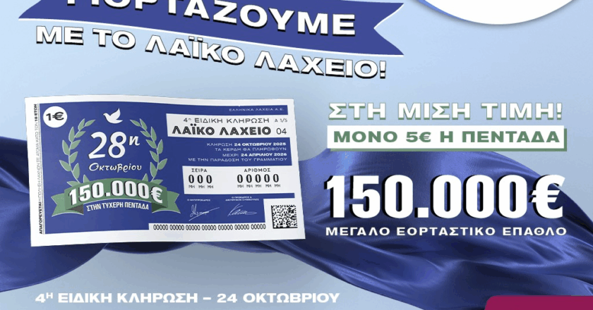 Λαϊκό Λαχείο: Την Παρασκευή 24 Οκτωβρίου η ειδική κλήρωση για την εθνική επέτειο της 28ης Οκτωβρίου – Στη μισή τιμή οι διαθέσιμοι λαχνοί και έπαθλο 150.000 ευρώ στον μεγάλο νικητή