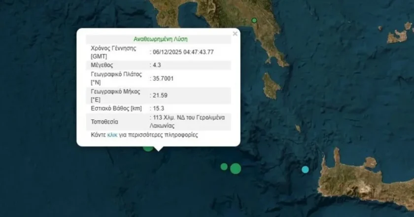 Σεισμός 4,3 Ρίχτερ νότια της Λακωνίας