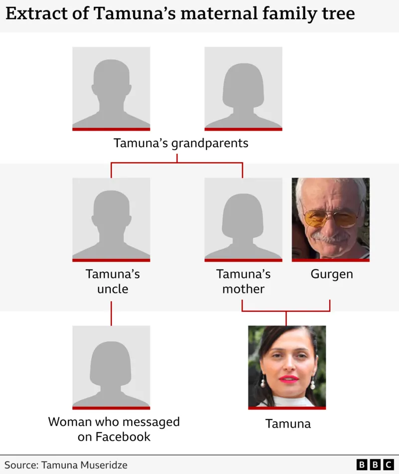 Ένα μήνυμα στην ομάδα της στο Facebook την έφερε σε επαφή με κάποιον που γνώριζε μια γυναίκα που είχε κρύψει μια εγκυμοσύνη και γέννησε στην Τιφλίδα τον Σεπτέμβριο του 1984, κοντά στην ημερομηνία της Ταμούνα. Ο πληροφοριοδότης της έδωσε ένα όνομα. Αφού την αναζήτησε χωρίς επιτυχία, η Ταμούνα τηλεφώνησε στο Facebook. Ένας χρήστης απάντησε, αποκαλύπτοντας ότι ήταν η θεία της Ταμούνα και συμφωνώντας να γίνει τεστ DNA.