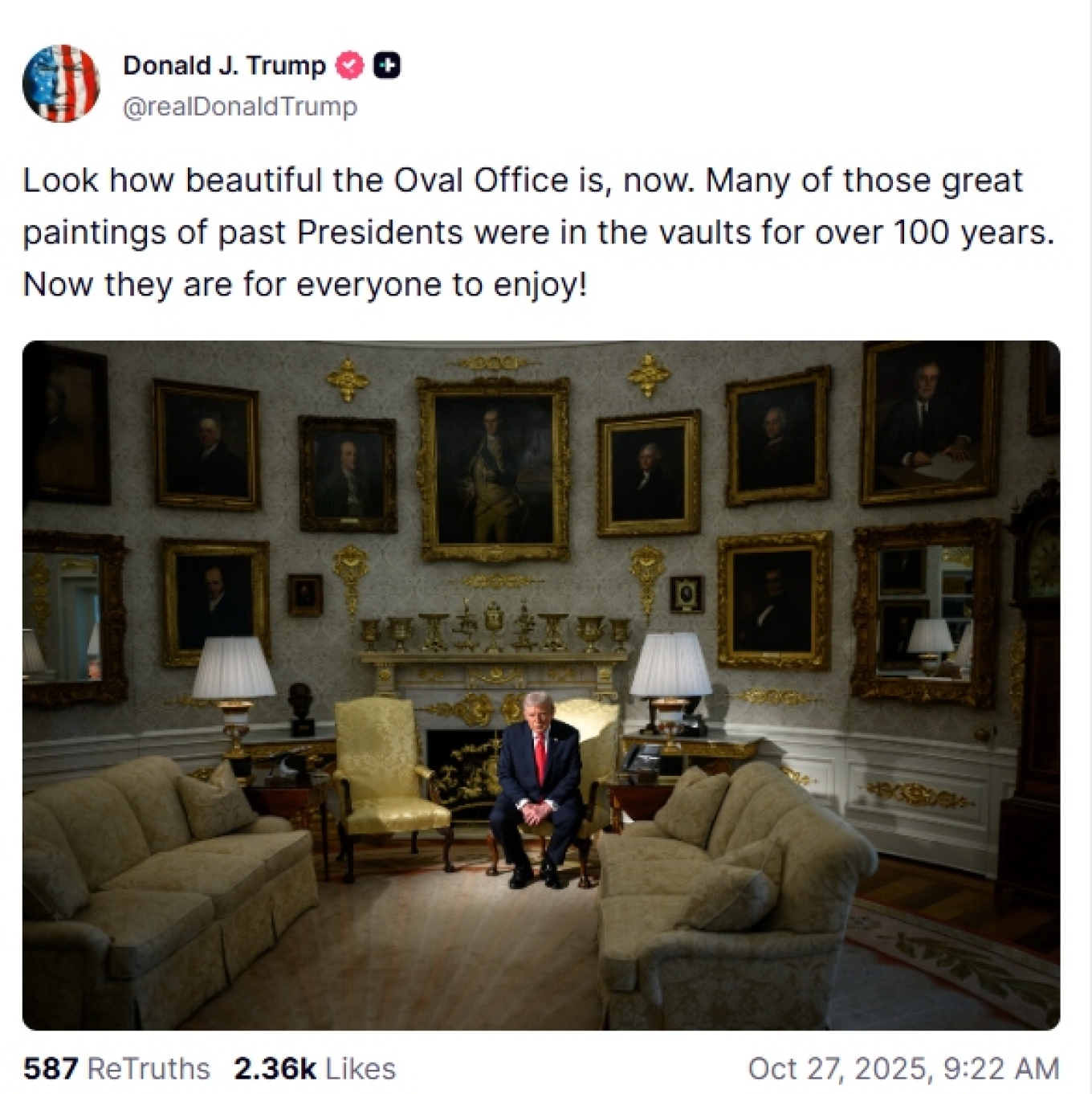 Ο ίδιος δείχνει ικανοποιημένος, γράφοντας στο Truth Social ότι το οβάλ γραφείο έγινε πολύ όμορφο με τις προσθήκες.