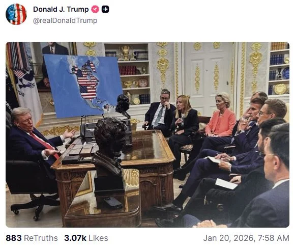 Στην ίδια εικόνα εμφανίζονται ο αντιπρόεδρος Τζέι Ντι Βανς και ο υπουργός Εξωτερικών Μάρκο Ρούμπιο δίπλα του, με τον Τραμπ ελαφρώς υπερυψωμένο ενώ κρατά τη σημαία, ενώ μια πινακίδα γράφει με κεφαλαία γράμματα: «Γροιλανδία, έδαφος των ΗΠΑ από το 2026».