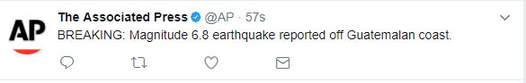 Σεισμός μεγέθους 6,8 ρίχτερ σημειώθηκε πριν από λίγα λεπτά στα ανοιχτά των ακτών της Γουατεμάλα, σύμφωνα με το Assosiated press.