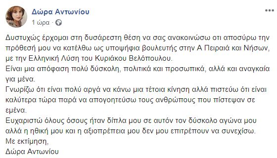 Η Δώρα Αντωνίου, που πολιτεύεται στην Α’ εκλογική περιφέρεια Πειραιά, ανακοίνωσε μέσω Facebook την αποχώρησή της.