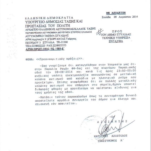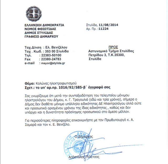 Η αστυνομία έστειλε έγγραφο στο Δήμο Στυλίδας με το οποίο ζητούσε να στείλει αρμόδιο συνεργείο για έλεγχο και επισκευή και ο Δήμαρχος που δεν είναι άλλος από τον Απόστολο Γκλέτσο, απάντησε ότι εδώ και 3 χρόνια δεν έχει ηλεκτρολόγο καιπαρέπεμψε την αστυνομία,  για περισσότερες πληροφορίες να απευθυνθεί στον Πρωθυπουργό Αντώνη Σαμαρά και στον Ευάγγελο Βενιζέλο.