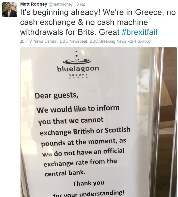 O Matt Rooney, από το Νότιγχαμ, ειδικός εκπαιδευτικός για άτομα με ειδικές ανάγκες στα σχολεία, βρίσκεται για διακοπές στην Ελλάδα και ανήρτησε στον λογαριασμό του στο Τwitter ένα σχόλιο, σύμφωνα με το οποίο το ανταλλακτήριο στο ξενοδοχείο που βρίσκεται δεν κάνει συναλλαγές για Βρετανούς.