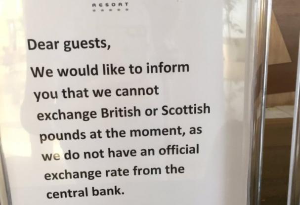 «Αγαπητοί πελάτες, θα θέλαμε να σας ενημερώσουμε ότι προς το παρόν δεν μπορούμε να κάνουμε ανταλλαγές συναλλάγματος για βρετανικές λίρες, καθώς δεν έχουμε την επίσημη ισοτιμία συναλλάγματος από την Κεντρική Τράπεζα».