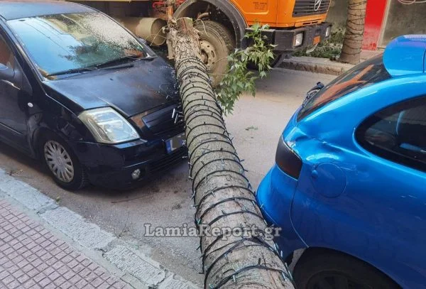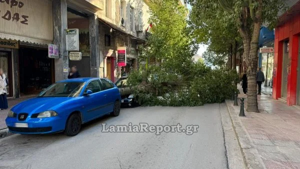 Μεγάλο δέντρο κατέρρευσε και έπεσε πάνω σε σταθμευμένα οχήματα στην οδό Σατωβριάνδου, στο κέντρο της Λαμίας, χωρίς ευτυχώς να τραυματιστεί κάποιος διερχόμενος.
