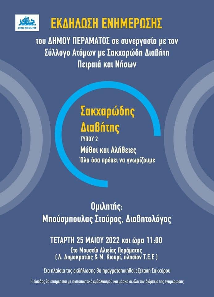 Με πολύ μεγάλη συμμετοχή πολιτών πραγματοποιήθηκε την Τετάρτη 25 Μαΐου 2022 ενημερωτική εκδήλωση για το Σακχαρώδη Διαβήτη, την οποία πραγματοποίησε ο Δήμος Περάματος σε συνεργασία με τον Σύλλογο Ατόμων με Σακχαρώδη Διαβήτη Πειραιά και Νήσων, στο Μουσείο Αλιείας και Ναυπηγικής Αλιευτικών Σκαφών στο Ν. Ικόνιο.