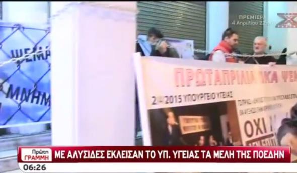 Τα μέλη της ΠΟΕΔΗΝ χρησιμοποίησαν αλυσίδες στην είσοδο του Υπουργείου και απ’ ό,τι φαίνεται δύσκολα θα αποχωρήσουν ανήμερα της Πρωταπριλιάς.