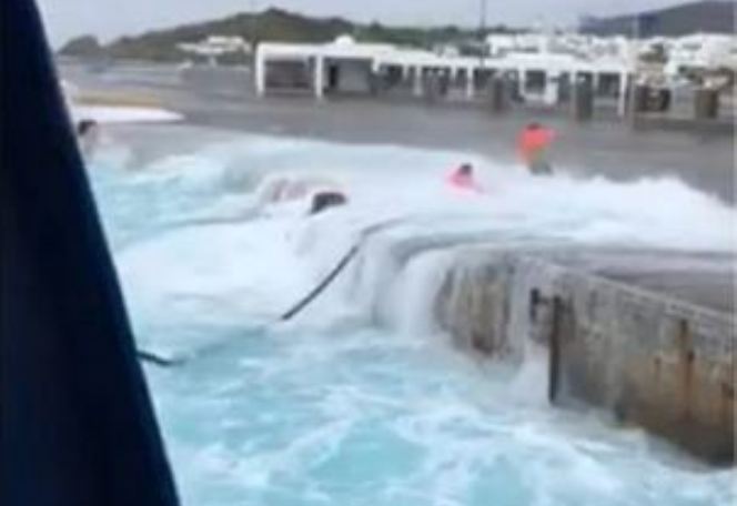 Μάλιστα, ο ένας πέφτει κάτω, ωστόσο στέκεται τυχερός, καθώς παρασύρεται προς το εσωτερικό του λιμανιού και όχι προς τη θάλασσα.