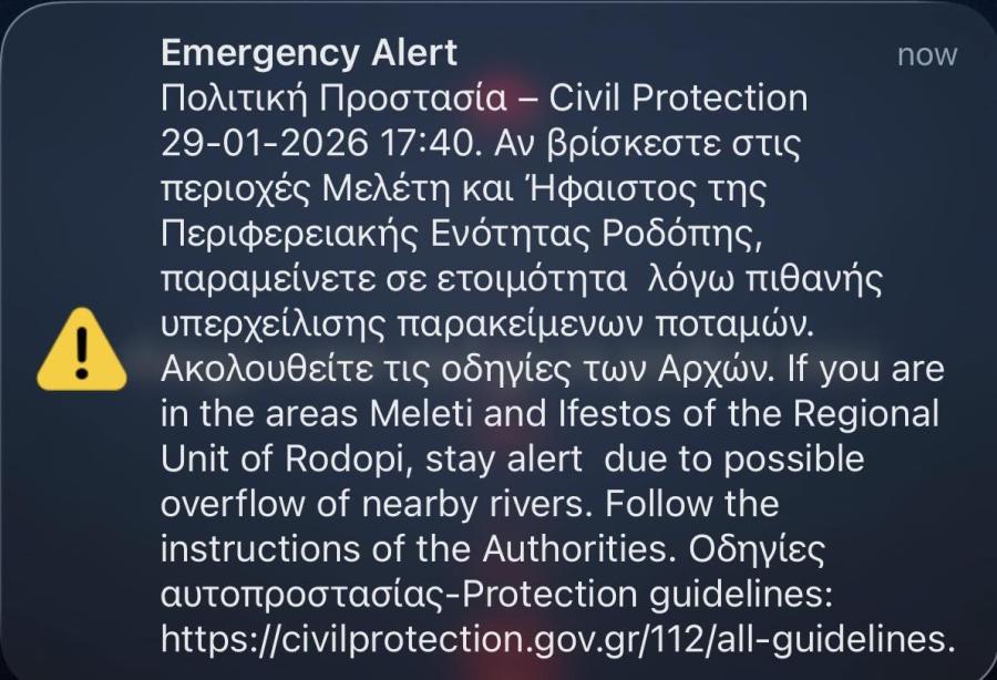 Το μήνυμα που στάλθηκε στα κινητά τηλέφωνα των κατοίκων έγραφε «Αν βρίσκεστε στις περιοχές Μελέτη και Ήφαιστος της Περιφερειακής Ενότητας Ροδόπης παραμείνετε σε ετοιμότητα λόγω πιθανής υπερχείλισης παρακείμενων ποταμών».