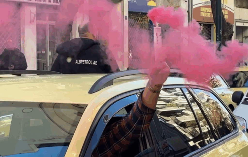 Με κόρνες και καπνογόνα ξεκίνησε η μηχανοκίνητη πορεία προς το υπουργείο Μεταφορών, των οδηγών ταξί, η οποίοι έχουν κυρήξει από σήμερα 48ωρη απεργία.