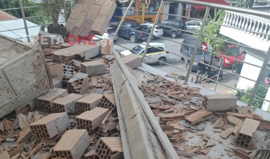 Τοίχος μπαλκονιού κατέρρευσε ολόκληρος από τον δυνατό αέρα, με τούβλα και υλικά να πέφτουν όχι μόνο στο μπαλκόνι που θύμιζε βομβαρδισμένο τοπίο, αλλά και στον δρόμο.