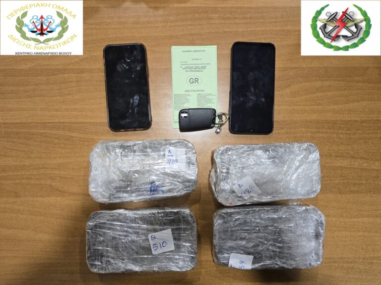 Στη σύλληψη 23χρονου για ναρκωτικά προχώρησαν λιμενικοί στο Βόλο, καθώς σε έλεγχο που διενεργήθηκε σε ταξί που οδηγούσε βρέθηκε να κατέχει στο πίσω κάθισμα του οχήματος τέσσερις νάιλον συσκευασίες με ποσότητα ηρωίνης συνολικού μικτού βάρους 1 κιλού και 961 γραμμαρίων.