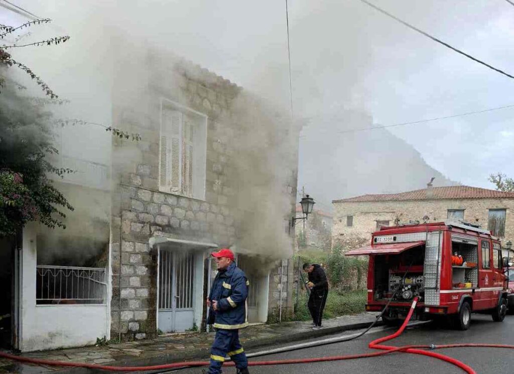 Η ώρα ήταν περίπου 11 πμ, όταν ένας μεσήλικας φέρεται να επιχείρησε να ανάψει φωτιά ρίχνοντας βενζίνη σε σόμπα ή τζάκι, προκαλώντας άθελά του ανάφλεξη. Στη στιγμή σημειώθηκε μικρο-έκρηξη και η πυρκαγιά εξαπλώθηκε ακαριαία από το ισόγειο στον επάνω όροφο του πέτρινου οικήματος, με συνέπεια να φουντώσει το πάτωμα και να προκληθούν εκτεταμένες υλικές ζημιές στο εσωτερικό της κατοικίας.