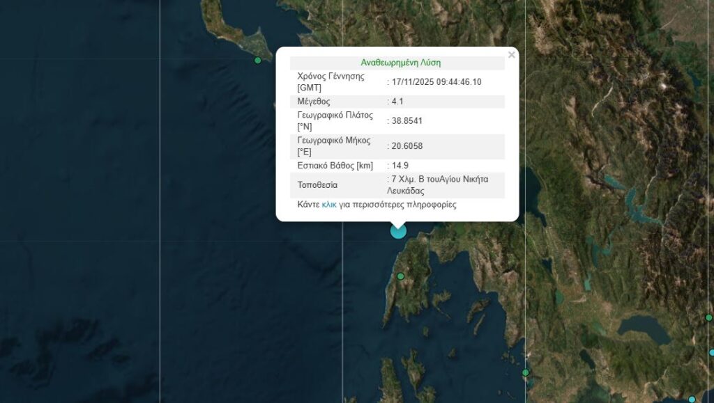 Σεισμός σημειώθηκε το πρωί της Δευτέρας 17/11 ανοιχτά της Λευκάδας. Σύμφωνα με την αναθεωρημένη λύση του Γεωδυναμικού Ινστιτούτου, ο σεισμός ήταν μεγέθους 4,1 βαθμών της κλίμακας Ρίχτερ και είχε επίκεντρο θαλάσσια περιοχή που βρίσκεται 7 χιλιόμετρα βόρεια του Αγίου Νικήτα.
