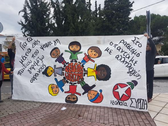 Οι νεαροί άνοιξαν έξω από το σχολείο ένα πανό που έγραφε «Για τα μάτια ενός παιδιού που ψάχνει γη γκρεμίζω ουρανούς. Στον ρατσισμό απαντάμε με αλληλεγγύη» υπογράφοντας ως νεολαία ΣΥΡΙΖΑ.