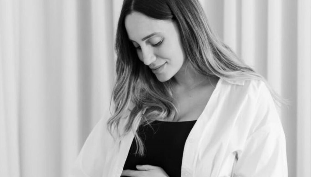 Η Άννα Κορακάκη στο στιγμιότυπο είναι αθλητικά ντυμένη, ενώ αγκαλιάζει τρυφερά τη φουσκωμένη της κοιλίτσα.