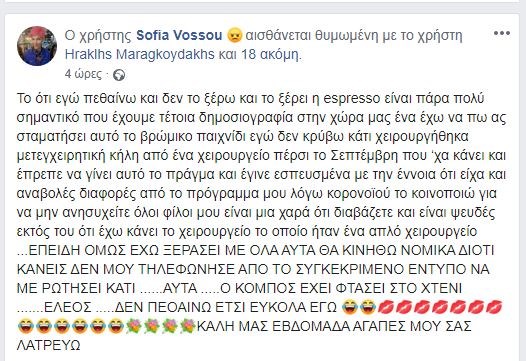 “Το ότι εγώ πεθαίνω και δεν το ξέρω και το ξέρει η espresso είναι πάρα πολύ σημαντικό που έχουμε τέτοια δημοσιογραφία στην χώρα μας ένα έχω να πω ας σταματήσει αυτό το βρώμικο παιχνίδι εγώ δεν κρύβω κάτι χειρουργήθηκα μετεγχειρητική κήλη από ένα χειρουργείο πέρσι το Σεπτέμβρη που ‘χα κάνει και έπρεπε να γίνει αυτό το πράγμα και έγινε εσπευσμένα με την έννοια ότι είχα και αναβολές διαφορές από το πρόγραμμα μου λόγω κορονοϊού το κοινοποιώ για να μην ανησυχείτε όλοι φίλοι μου είναι μια χαρά ότι διαβάζετε και είναι ψευδές εκτός του ότι έχω κάνει το χειρουργείο το οποίο ήταν ένα απλό χειρουργείο …ΕΠΕΙΔΗ ΟΜΩΣ ΕΧΩ ΞΕΡΑΣΕΙ ΜΕ ΟΛΑ ΑΥΤΑ ΘΑ ΚΙΝΗΘΩ ΝΟΜΙΚΑ ΔΙΟΤΙ ΚΑΝΕΙΣ ΔΕΝ ΜΟΥ ΤΗΛΕΦΩΝΗΣΕ ΑΠΟ ΤΟ ΣΥΓΚΕΚΡΙΜΕΝΟ ΕΝΤΥΠΟ ΝΑ ΜΕ ΡΩΤΗΣΕΙ ΚΑΤΙ ……ΑΥΤΑ …..Ο ΚΟΜΠΟΣ ΕΧΕΙ ΦΤΑΣΕΙ ΣΤΟ ΧΤΕΝΙ …….ΕΛΕΟΣ …..ΔΕΝ ΠΕΟΑΙΝΩ ΕΤΣΙ ΕΥΚΟΛΑ ΕΓΩ. ΚΑΛΗ ΜΑΣ ΕΒΔΟΜΑΔΑ ΑΓΑΠΕΣ ΜΟΥ ΣΑΣ ΛΑΤΡΕΥΩ”, έγραψε σε ανάρτησή της στο Facebook η Σοφία Βόσσου.