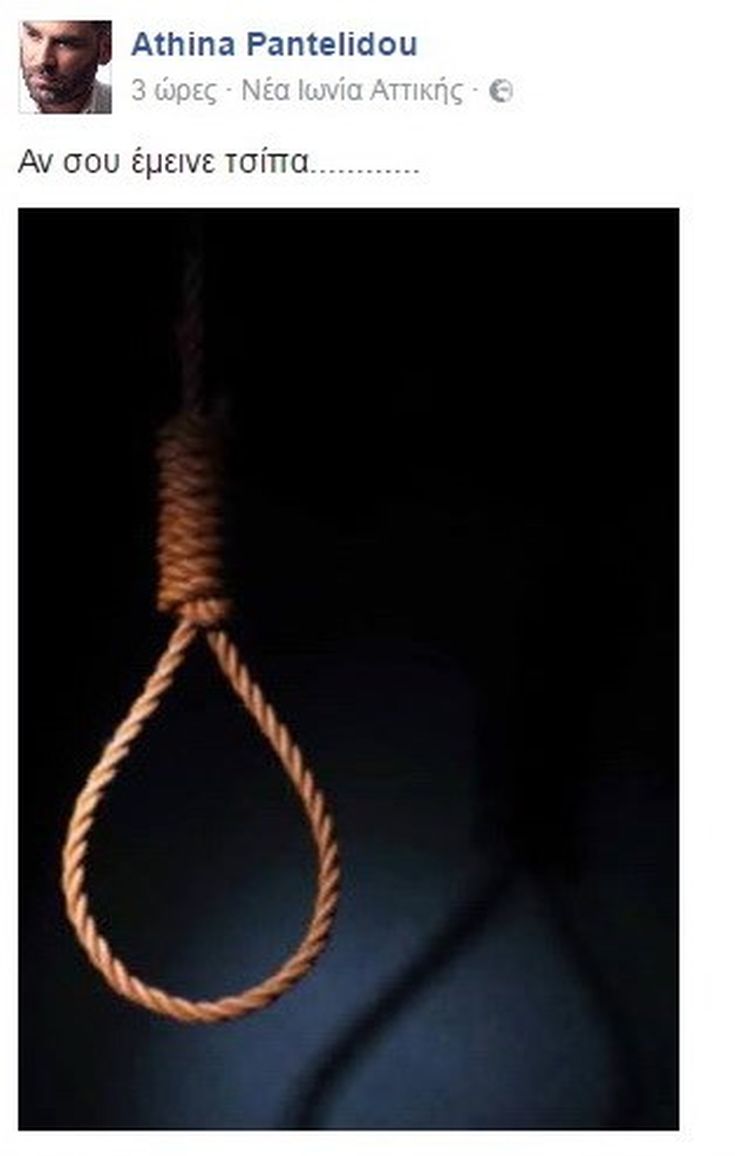 Αίσθηση έχει προκαλέσει η ανάρτηση της μητέρας του Παντελή Παντελίδη, Αθηνάς, η οποία εννέα μήνες μετά το χαμό του γιου της στις 18 Φεβρουαρίου ανέβασε στον λογαριασμό της στο Facebook τη φωτογραφία μίας κρεμάλας.