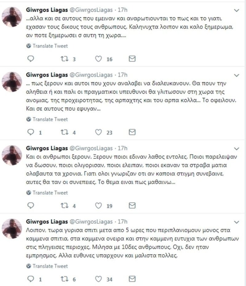 «Λοιπόν, τώρα γύρισα σπίτι μετά από 5 ώρες που περιπλανιόμουν μόνος στα καμένα σπίτια, στα καμένα όνειρα και στην καμένη ευτυχία των ανθρώπων στις πληγείσες περιοχές. Μίλησα με δεκάδες ανθρώπους. Όχι, δεν ήταν εμπρησμός. Αλλά ευθύνες υπάρχουν και μάλιστα πολλές.