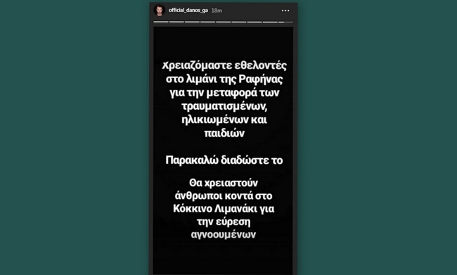 Οι επώνυμοι, όπως και όλοι οι Έλληνες παρακολουθούν σοκαρισμένοι τα γεγονότα. Πολλοί από αυτούς κάνουν εκκλήσεις στα social media προσπαθώντας να βοηθήσουν τους συνανθρώπους μας. Ο Γιώργος Αγγελόπουλος «ανέβασε» πριν από λίγο στο instastories του φωτογραφίες με αγνοούμενους αλλά και έκκληση για εθελοντές στο λιμάνι της Ραφήνας.