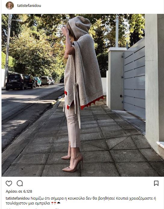 Βλέποντας τον βροχερό καιρό έβαλε ζακέτα με κουκούλα. Κομψά ντυμένη πόζαρε στην είσοδο του σπιτιού της και «ανέβασε» φωτογραφία της στο instagram.
