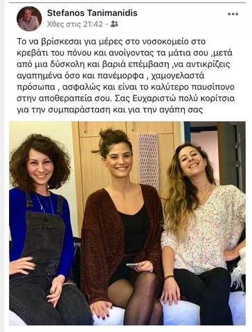 Στο πλάι του είναι συνέχεια η οικογένειά του και ειδικά οι γυναίκες, όπως η κόρη του και η σύντροφος του Σάκη, Χριστίνα Μπόμπα τις οποίες ανέβασε και σε φωτογραφία από την επίσκεψή τους στο νοσοκομείο.