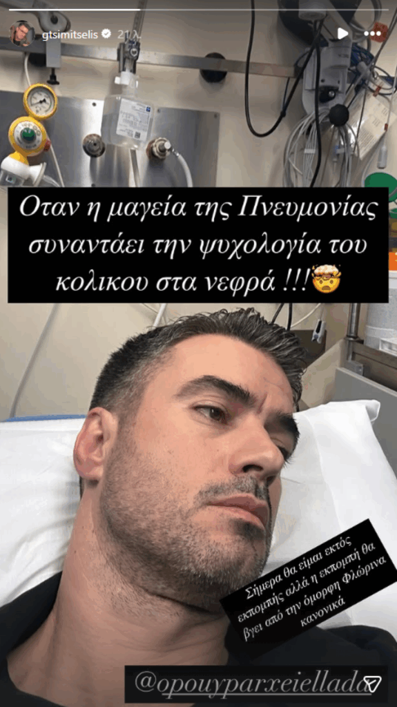 «Όταν η μαγεία της πνευμονίας συναντάει την ψυχολογία του κολικού στα νεφρά», προσθέτοντας ότι «σήμερα θα είμαι εκτός εκπομπής, αλλά η εκπομπή θα βγει από την όμορφη Φλώρινα κανονικά», έγραψε ο ηθοποιός.