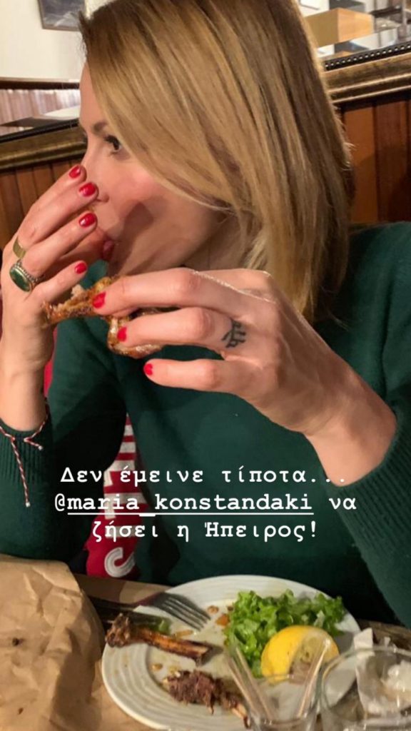 Χθες το ζευγάρι απόλαυσε τα παϊδάκια του στο Ανήλιο του Μετσόβου σε ένα γραφικό… μπακάλικο και η Τζένη μοιράστηκε μαζί μας τη στιγμή που έχει τελειώσει το φαγητό της και γλύφει και τα δάχτυλά της!