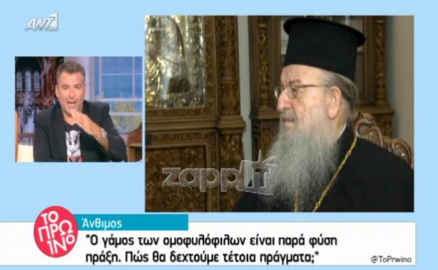 «Ας κοιτάξει τα του χώρου του γιατί η ομοφυλοφιλία ανθεί σε περισσότερο ποσοστό  στους χώρους της Εκκλησίας από ότι έξω», είπε ο παρουσιαστής και συνέχισε: «Στη Βουλιαγμένη τα περισσότερα σπίτια ανήκουν στην Εκκλησία. Υπάρχει τεράστια εκκλησιαστική περιουσία και μιλάμε ότι στη Βουλιαγμένη τα σπίτια αυτά είναι εκατομμυρίων. Είναι προκλητικό να λέει ότι έχουν πέσει τα ενοίκια όταν ο άλλος δεν έχει να φάει. Δηλαδή τι; Πεινάει η εκκλησία; Δεν κατάλαβα! Μην ανοίξω το στόμα μου για επωνύμους οι οποίοι νοικιάζουν φιλέτα της εκκλησίας σε πολύ top περιοχές αντί πινακίου φακής! Πληρώνουν δηλαδή 50 ευρώ το μήνα για σπίτια που θα έπρεπε να έχουν 2.000 ενοίκιο. Ο κος Άνθιμος θα βγει να μας πει γι' αυτά;