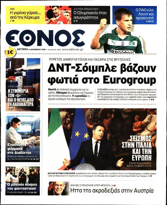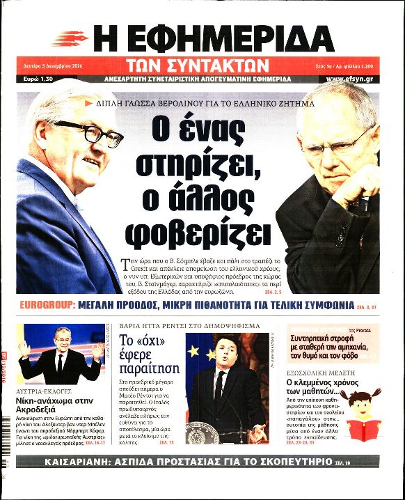 MEDIA Τα πρωτοσέλιδα των εφημερίδων 5 Δεκεμβρίου, 2016, 7:36 πμ5 Δεκεμβρίου, 2016 0 Facebook share Twitter