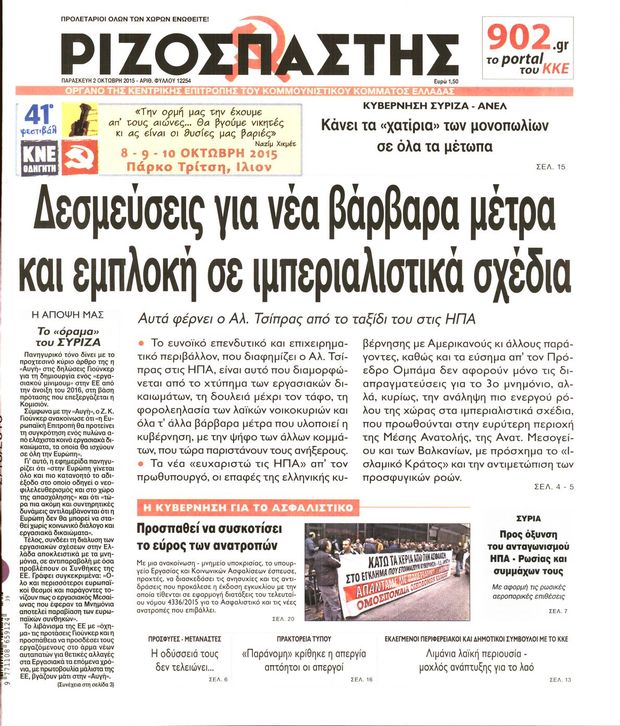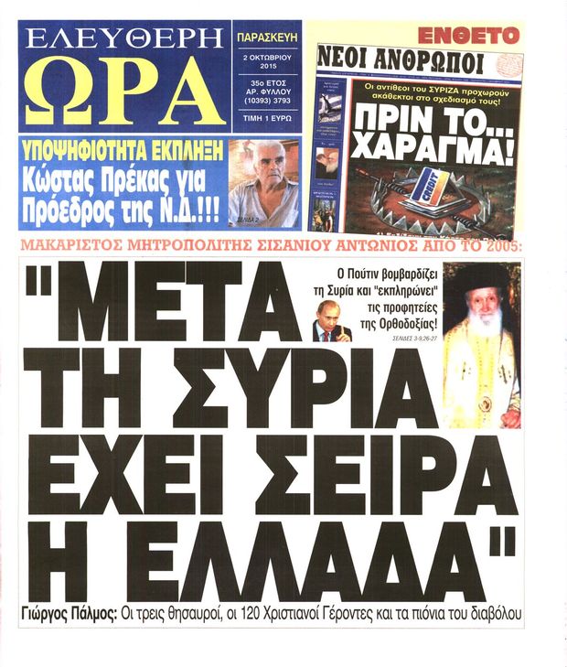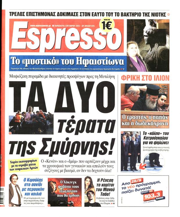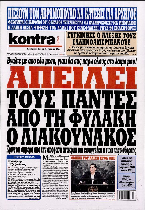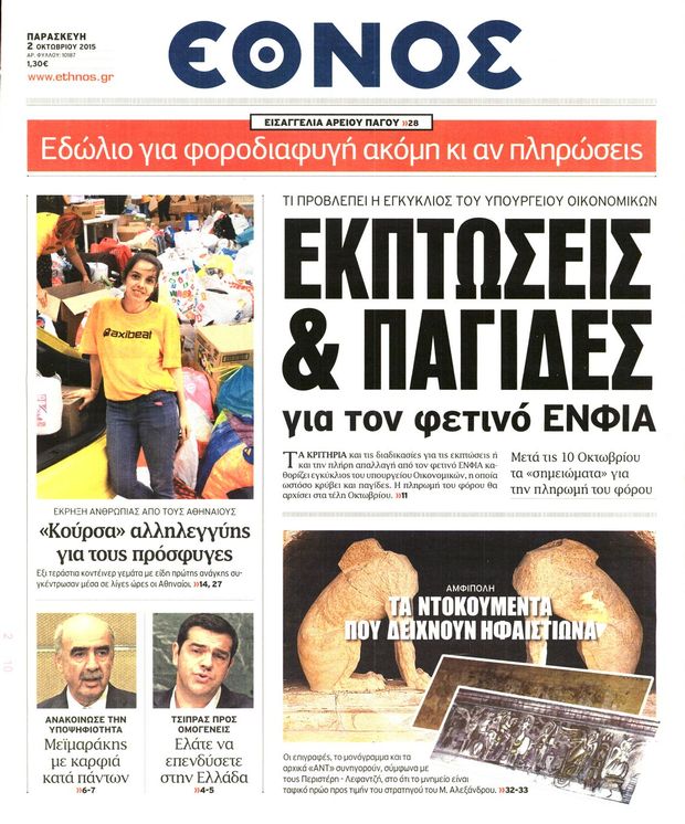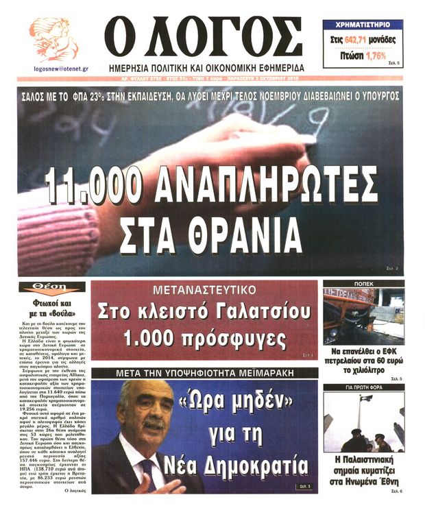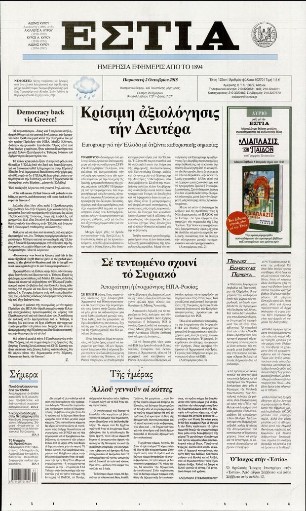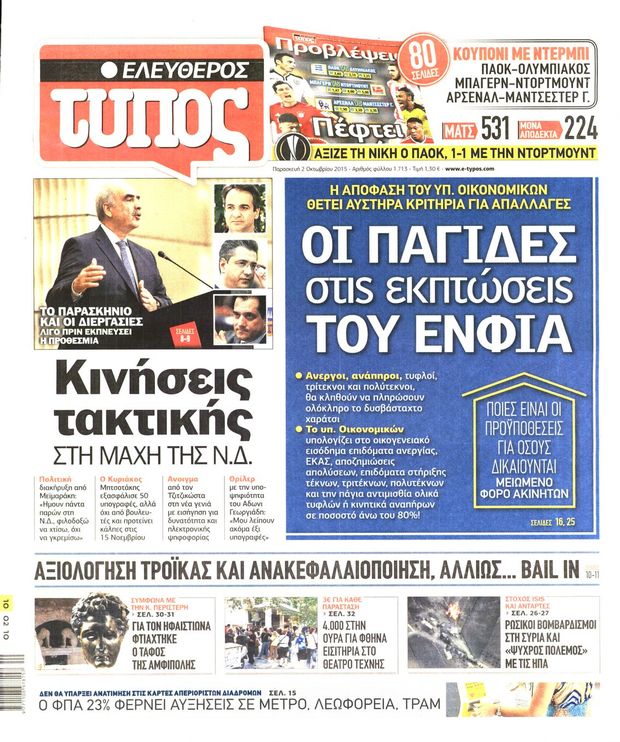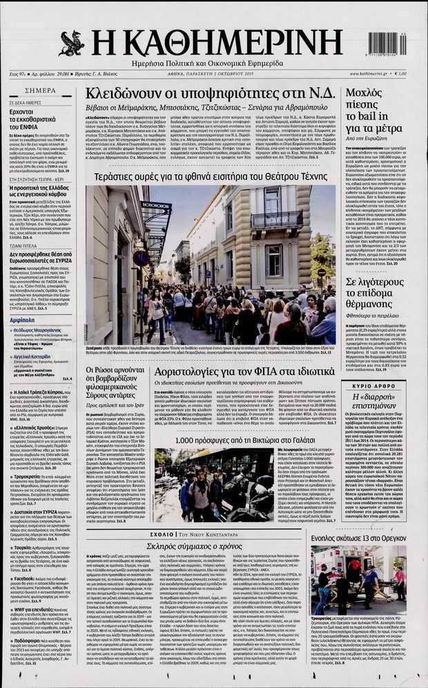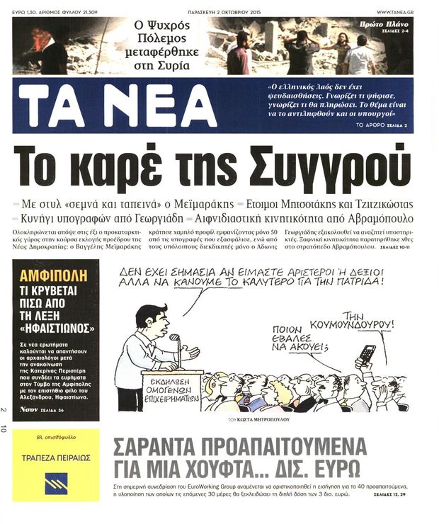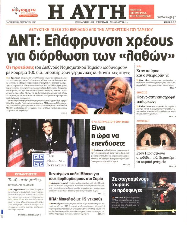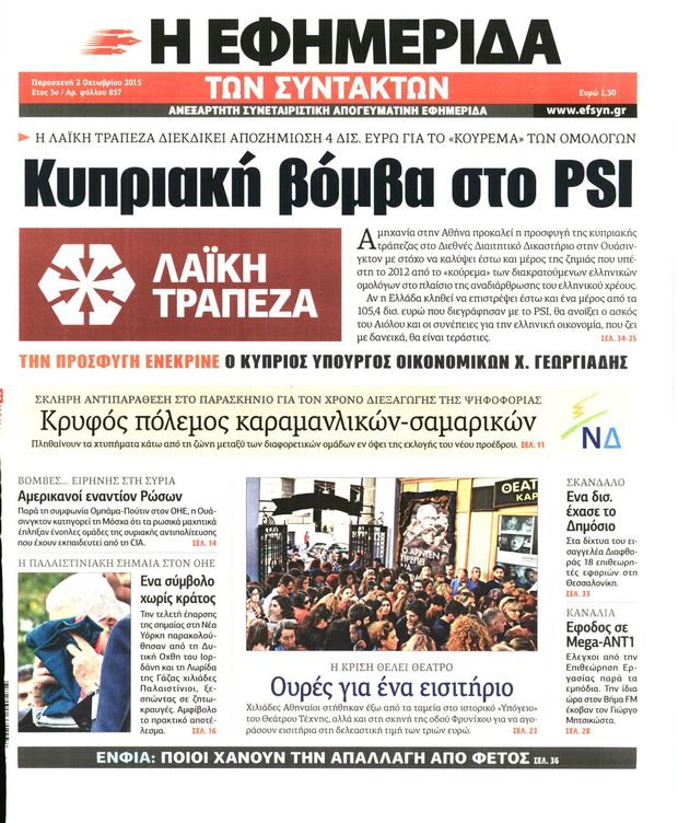 MEDIA Τα πρωτοσέλιδα των εφημερίδων 2 Οκτωβρίου, 2015, 7:55 πμ2 Οκτωβρίου, 2015 0 Facebook share Twitter