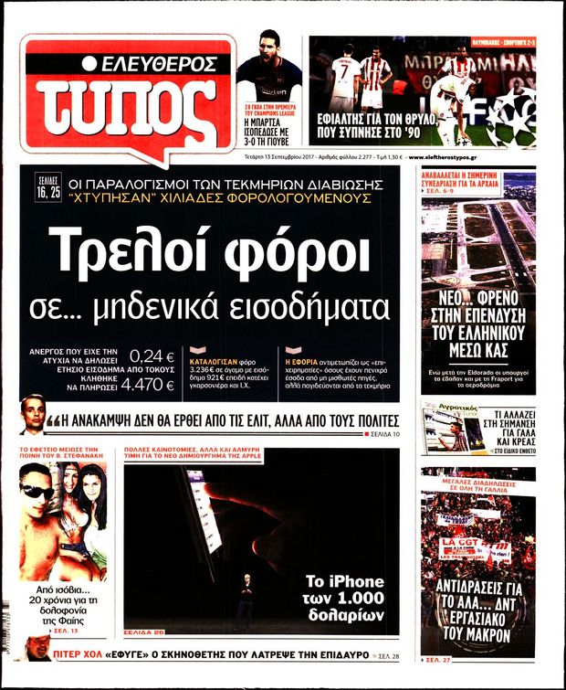 MEDIA Τα πρωτοσέλιδα των εφημερίδων 13 Σεπτεμβρίου, 2017, 8:00 πμ13 Σεπτεμβρίου, 2017 0 Facebook share Twitter