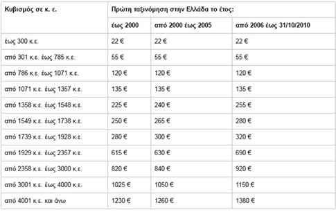 Για επιβατηγά αυτοκίνητα, δίκυκλες και τρίκυκλες μοτοσικλέτες που έχουν ταξινομηθεί έως 31/10/2010, ο υπολογισμός των τελών κυκλοφορίας γίνεται αποκλειστικά βάσει του κυβισμού τους.