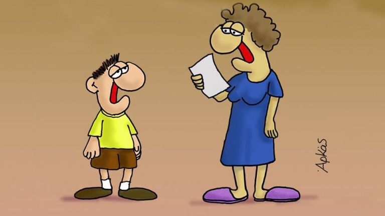Στο νέο σκίτσο ο πρωθυπουργός ενημερώνεται ότι οι επιδόσεις του στα αγγλικά έχουν… απογοητεύσει την δασκάλα των αγγλικών.
