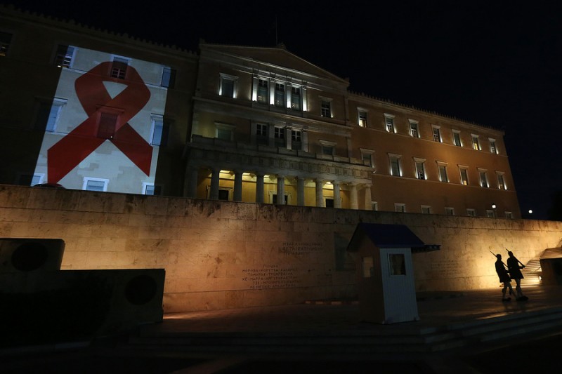 Στη πρόσοψη του κτιρίου της Βουλής προβάλει το σύμβολο για την ευαισθητοποίηση του κοινού απέναντι στον ιό του AIDS.