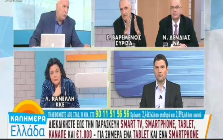 Ανέβηκαν οι τόνοι στην πρωινή εκπομπή του Γιώργου Παπαδάκη στον Ant1, ανάμεσα στον βουλευτή του ΣΥΡΙΖΑ, Γιώργο Βαρεμένο και στην βουλευτή του ΚΚΕ Λιάνα Κανέλλη, με αποτέλεσμα ο παρουσιαστής να αναγκαστεί να πάει σε διαφημίσεις.