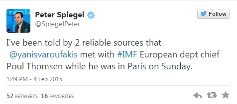 Σε ανάρτησή του στο Twitter, ο Πίτερ Σπίγκελ επικαλείται «δύο αξιόπιστες πηγές» του είπα ότι ο κ. Βαρουφάκης είδε την Κυριακή στο Παρίσι τον Πολ Τόμσεν, επικεφαλής της Διεύθυνσης Ευρωπαϊκών Υποθέσεων του ΔΝΤ.