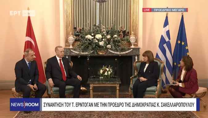 Την κοινή τους βούληση για βελτίωση των ελληνοτουρκικών σχέσεων, εξέφρασαν η Πρόεδρος της Δημοκρατίας Κατερίνα Σακελλαροπούλου και ο Τούρκος Πρόεδρος Ρετζέπ Ταγίπ Ερντογάν στη συνάντησή τους που είναι αυτή την ώρα σε εξέλιξη στο Προεδρικό Μέγαρο.