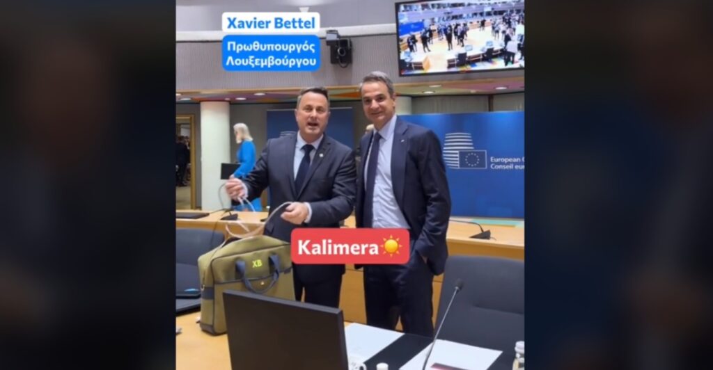 Το βίντεο ξεκινάει με τον πρωθυπουργό να συναντάει τον ομόλογό του στο Λουξεμβούργο και να του ζητάει να πει κάτι στην κάμερα στα ελληνικά: «Καλημέρα, καλά, μια χαρά, ευχαριστώ πολύ» λέει ο Ξαβιέ Μπετέλ και τον ξαναρωτάει ο Μητσοτάκης αν θέλει να προσθέσει κάτι άλλο με τον πρωθυπουργό του Λουξεμβούργου να εύχεται «Χρόνια Πολλά».