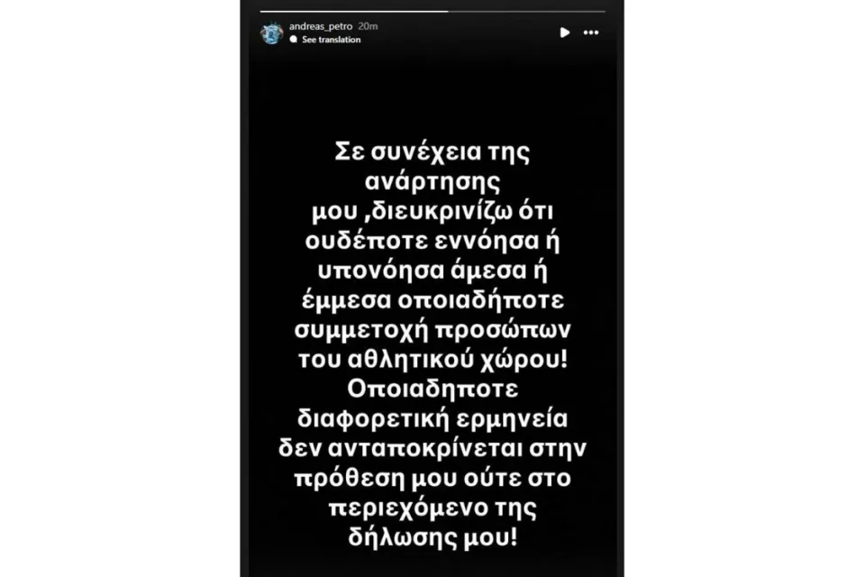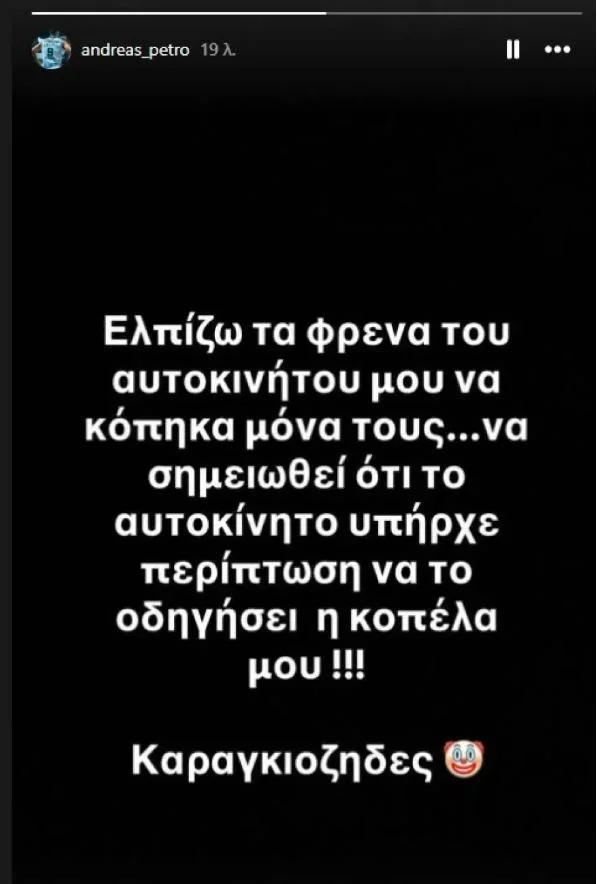 Μετά το τέλος της αναμέτρησης ο Ανδρέας Πετρόπουλος, προκάλεσε συζητήσεις με ένα Instagram story που ανέφερε: «Ελπίζω τα φρένα του αυτοκινήτου μου να κόπηκαν μόνα τους. Να σημειωθεί ότι υπήρχε περίπτωση να το οδηγήσει η κοπέλα μου. Καραγκιόζηδες».