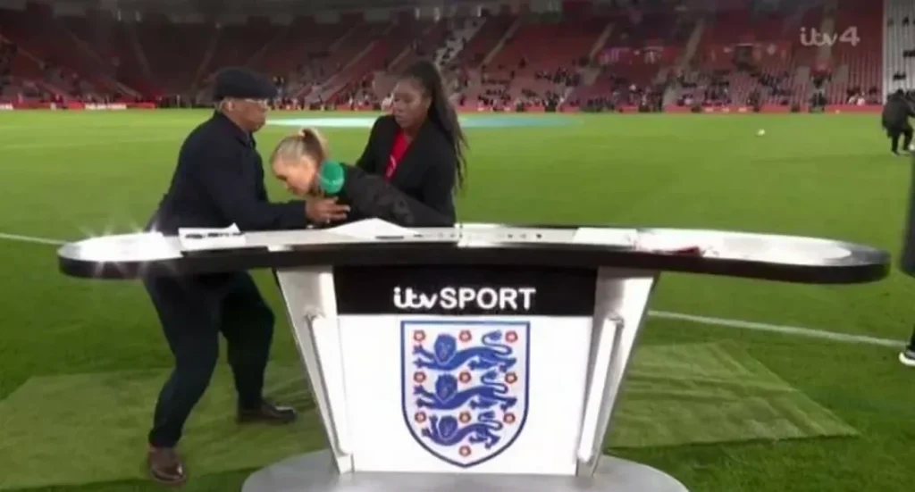 Η δημοσιογράφος βρισκόταν στο ITV4 μαζί με τον παλαίμαχο φορ της Άρσεναλ, Ίαν Ράιτ, και την συνάδελφό της, Ανίτα Ασάντε, όταν συνέβη το περιστατικό.