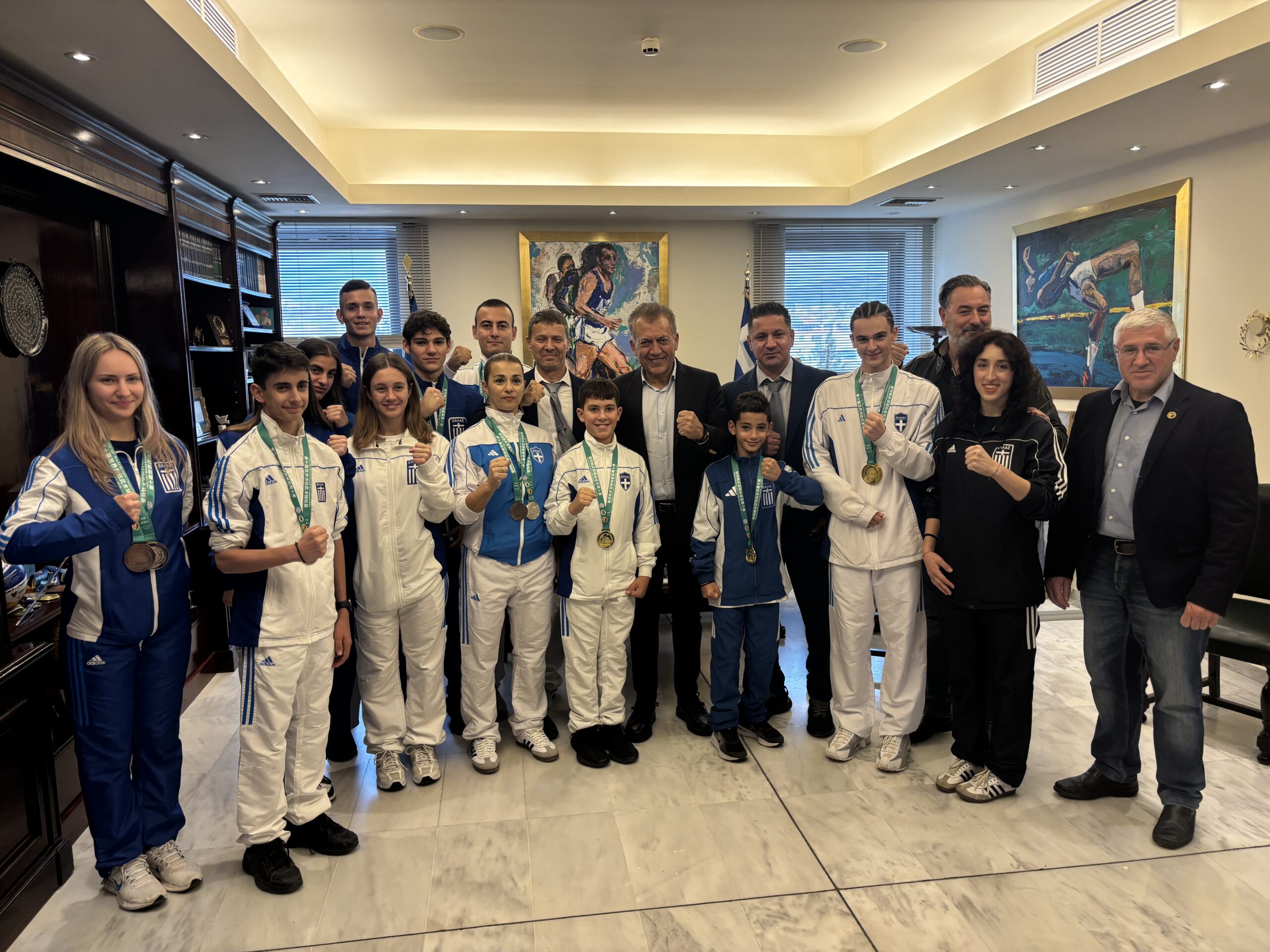 Τα συγχαρητήρια για τη διάκριση τους έδωσε από κοντά ο αναπληρωτής Υπουργός Αθλητισμού Γιάννης Βρούτσης ο οποίος υποδέχθηκε τη χρυσή ομάδα στο γραφείο του.